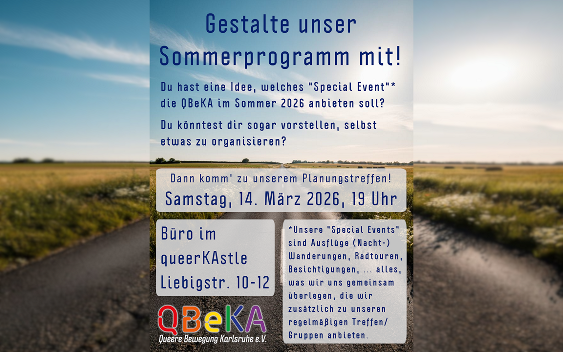Auch auf QueerKA.de sind wir natürlich mit einer Seite (QueerKA.de/QBeKA) und mit unseren aktuellen Veranstaltungen vertreten.
