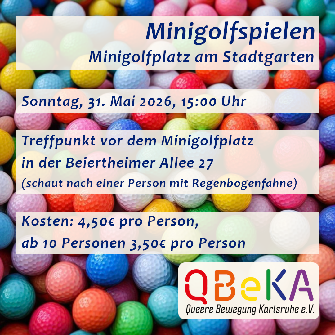 Wir treffen uns um 15:00 Uhr vor dem Minigolfplatz am Zoo gegenüber des Polizeipräsidiums Südwest, Beiertheimer Allee 27. Schaut nach einer Person mit einer Regenbogenfahne.